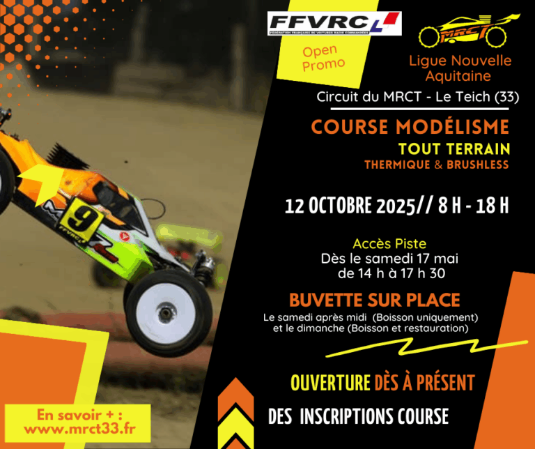 C’EST PARTI — LES INSCRIPTIONS SONT LANCÉES ! Rendez-vous le dimanche 12 octobre 2025 sur la piste du MRCT au Teich pour une course régionale qui promet un max d’adrénaline Catégories : 1/8 TT Thermique Open/Promo 1/8 TT Brushless Open/Promo…